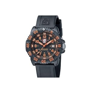 Perfect for low-light or no-light situations, the Luminox Men's Navy SEAL Colormark watch glows 100 times brighter than other luminous watches, which allows for easier visibility. This timepiece This versatile timepiece is constructed with a 44-millimeter polyurethane case and matching durable polyurethane band, which includes a buckle clasp with safety mechanism. Striking orange Arabic numerals contrast with the classic black dial, while smaller orange numerals mark the 24-hour clock. In addition, a handy date calendar rests at the three o'clock position, and the unidirectional, textured, polyurethane bezel features brilliant orange minute indexes for easy readability. Powered by analog-quartz movement and protected by a durable mineral dial window, this watch is preferred by US Navy SEALs and US Air Force Pilots, and is water resistant to a depth of 660 feet.