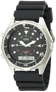 Stylish enough for the boardroom but rugged enough for the wakeboard, the Casio Marine stainless steel analog-digital watch for men (model AMW320R-1EV) combines the timeless look of an analog watch with the functionality of a digital watch. This analog digital combination allows you to see up to 2 times or the date with day of the week. The round silver stainless steel case measures 45mm wide (1.77 inches), and it's complemented by a black resin sports strap. The inner rim of the bezel provides an Arabic numeral readout with small minute indexes, and the black face includes luminous hour markers, oversized luminous hands (with seconds hand), and a digital window above the 6 o'clock mark.